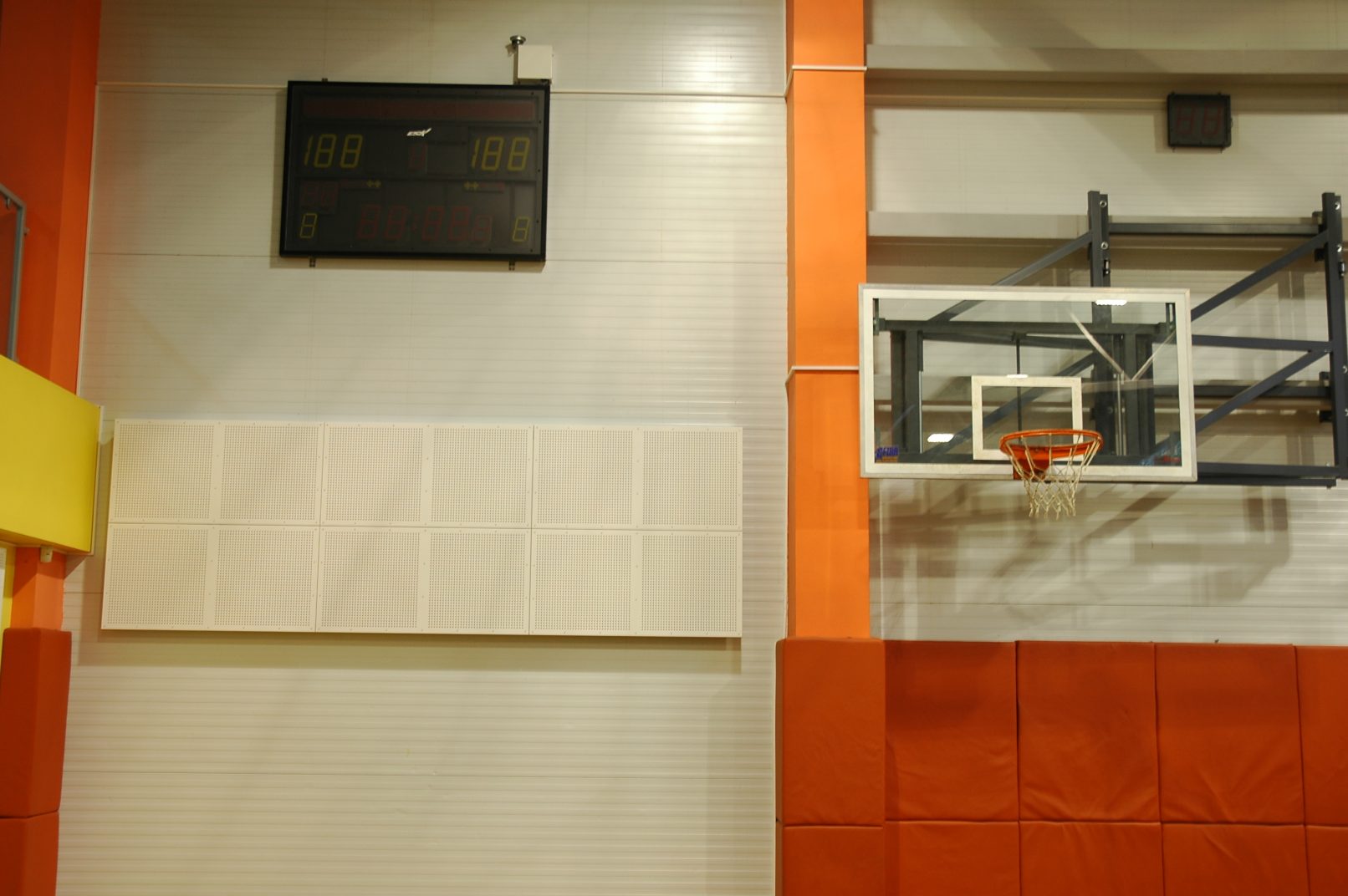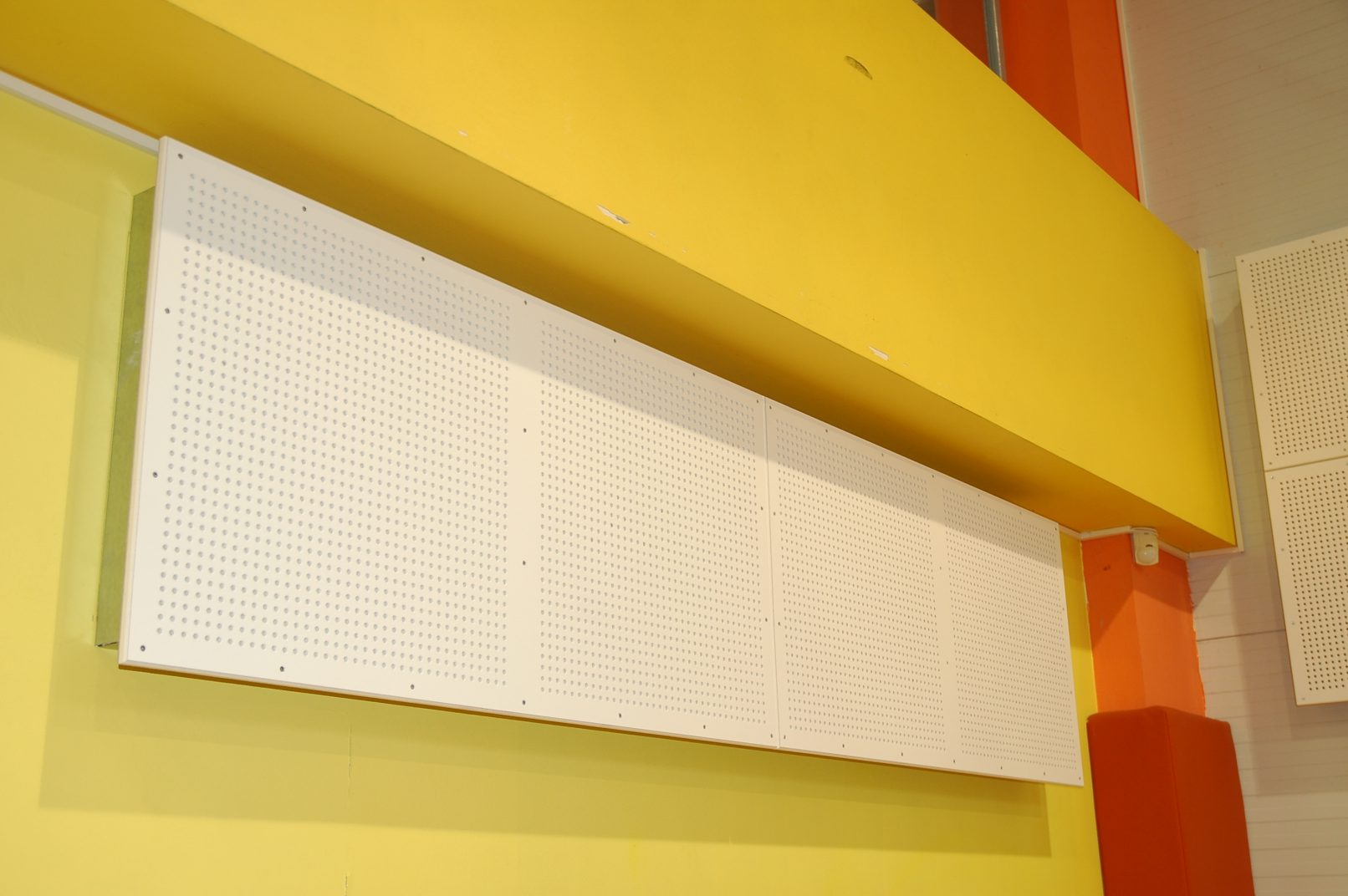 Patalpos akustikos korekcijai panaudotos dalį perteklinių žemų ir vidutinių dažnių garsų sugeriančios akustinės plokštės. Tai akustinių absorbcinių plokščių masyvai, kuriems, atlikus sudėtingus skaičiavimus, buvo parinktos atitinkamos montavimo vietos ant salės sienų ir lubų. Sistema veikia „Helmholtz“ rezonatorių principu, dalį tiesioginių garso spindulių sugerdama, o dalį atspindėdama. Šio tipo plokštės atsparios smūgiams, nereikalaujančios papildomos priežiūros. Galimi įvairūs akustinių absorbcinių plokščių dizaino variantai.