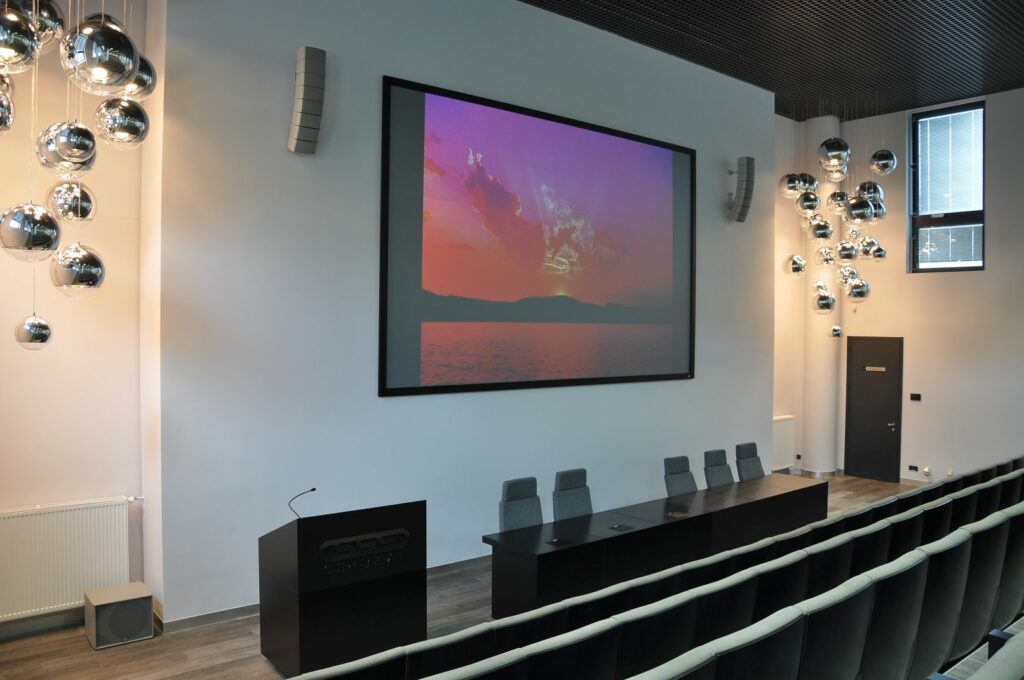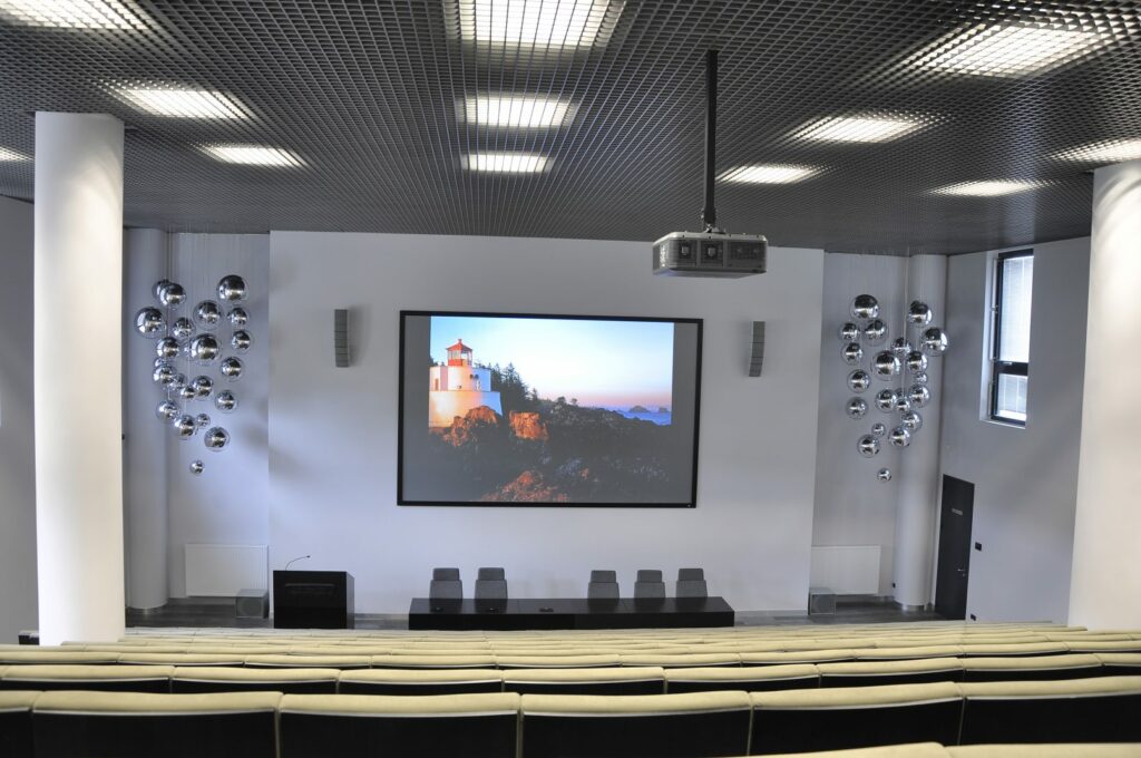 Konferencijų salėje sumontuotas didelės raiškos NEC vaizdo projektorius ir aukštą atspindžio koeficientą turintis firmos ADEO vaizdo ekranas, todėl vaizdinė informacija didžiuliame ekrane puikiai matoma net ir apšviestoje patalpoje. Konferencijų dalyviai savo kompiuterius arba mobilius prietaisus prie salės audiovizualinės sistemos gali prijungti net keturiose vietose per KRAMER komutacines dėžutes, sumontuotas solidžiuose medžio masyvo balduose.