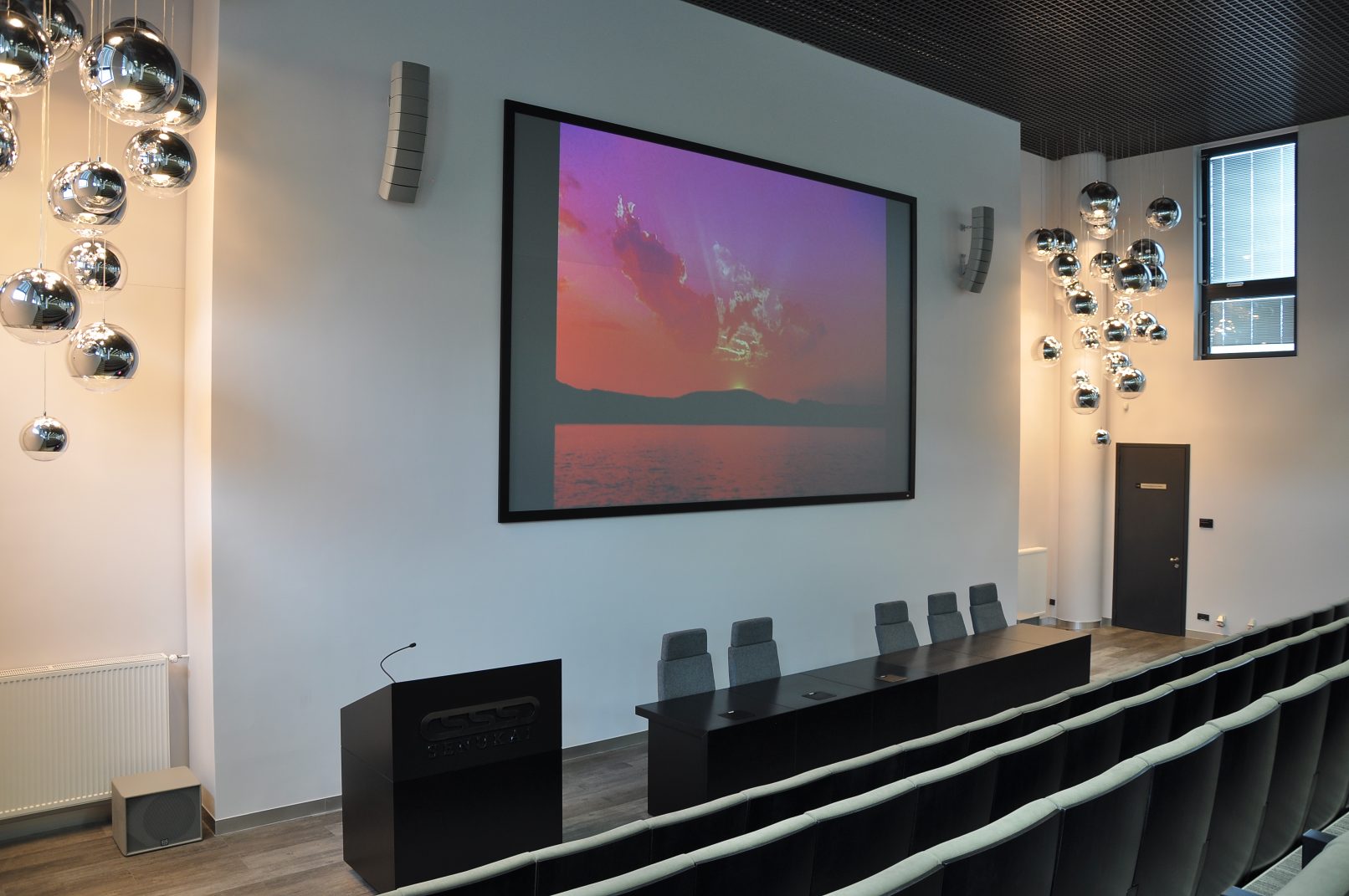 Konferencijų salėje įrengta moderni Martin Audio garso sistema Omniline. Miniatiūrinė modulinė akustinė sistema Omniline yra sudaryta iš akustinių modulių, kurie montuojami į bendrą, vertikaliai formuojamą masyvą. Kiekvienas modulis skleidžia garsą 100 laipsnių horizontaliai ir 5 laipsnius vertikaliai. Modulių kiekis nustatomas pagal patalpos fizinius parametrus, modeliuojant specialia programine įranga. Kai sistemos dydis apskaičiuotas programiškai, ją galima surinkti iš nustatyto modulių kiekio. Programa nurodo kokiu kampu moduliai turi būti nukreipti į klausytoją. Sistema surenkama modulio narelius montuojant į programos nurodytą poziciją. Kai sistema surinkta, ji pakabinama numatytame aukštyje. Tokia akustinė sistema skleidžia garsą labai tiksliai į tas vietas, kurios buvo numatytos programuojant patalpos akustinį rezultatą. Be abejo garso slėgis bus vienodas ir tolygus visoje erdvėje. Kadangi sistema sudaryta iš modulių, kurie skleidžia garsą ypatingai siaura vertikale, nėra pavojaus, kad susidarys garso atspindžiai. Tokiu būdu sistema leidžia tolygiai paskirstyti garso kryptį į pageidaujamą vietą ir nustatyti sistemą taip, kad garsas nesklistų į nereikalingas erdves ar plokštumas, kuriose gali susidaryti nepageidaujami garso atspindžiai. Garso sistemoje panaudotas naujasis firmos AMC garso signalų skaitmeninis procesorius DSP88, valdomas kompiuterinio tinklo pagalba. Salėje sumontuoti ir papildomi prisijungimai, leidžiantys naudoti garso įrangą didesniems renginiams.