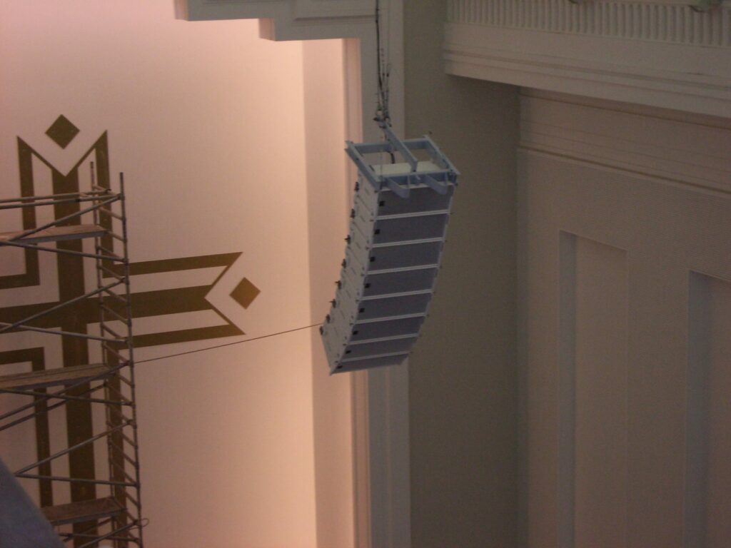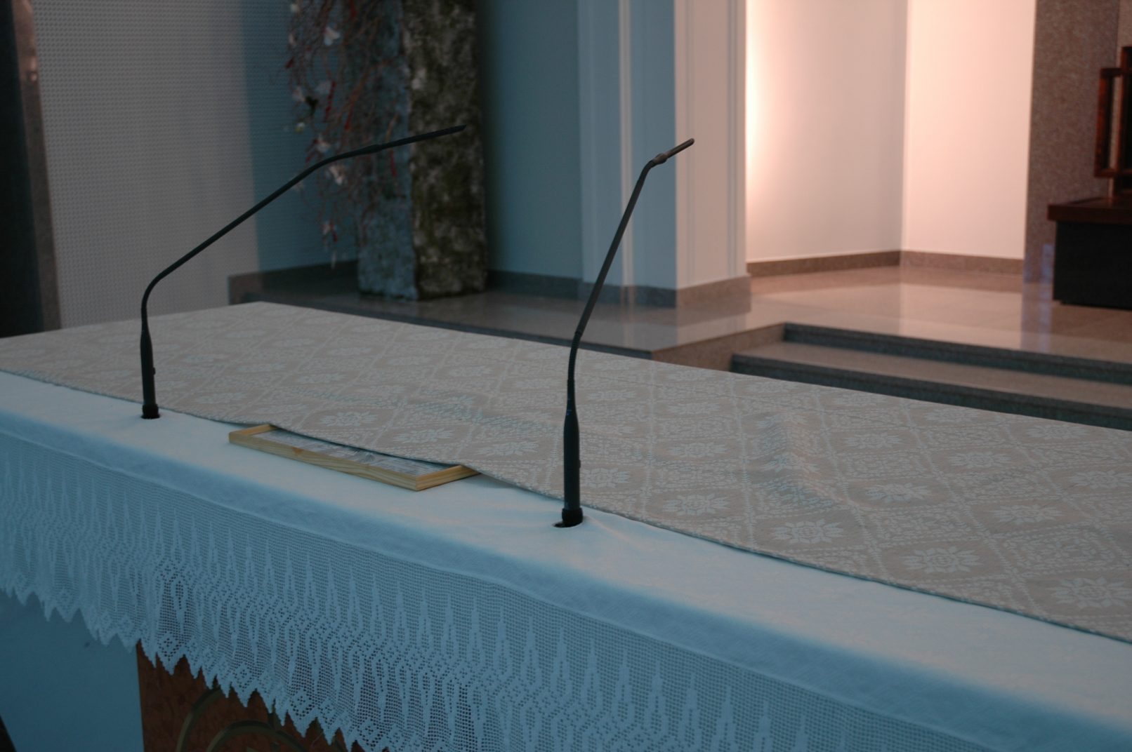 „Line array“ – sistema sudaryta iš daugelio garsiakalbių, formuojamų pagal vertikalę, sukuriant atitinkamos garso sklaidos šaltinį. Tokio suformuoto masyvo elementai iš anksto nukreipiami pagal vertikalią plokštumą reikiamu kampu, kad užtikrintų tolygų garso paskirstymą skaičiavimuose numatytoje erdvėje. Kiekvieno „line array“ modulio garso sklidimo kryptis preciziškai sureguliuota, pati akustinė sistema pakabinta bažnyčios centrinėje dalyje virš altoriaus. Šio sprendinio rezultatas – atkuriamo garsinio signalo, ar tai būtų kalbančiojo balsas, ar skambanti muzika – vienodas girdimumas visame bažnyčios plote.