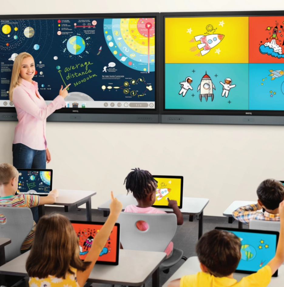 Interactive screens combine video display with touch input and integrated PCU that can run apps internally, providing complete user interface solution in a single hardware unit. Interactive screens are widely used in education environment as digital blackboard, replacing traditional projector systems with more advanced hardware and software functionality, also they can be integrated as part of hybrid classroom.