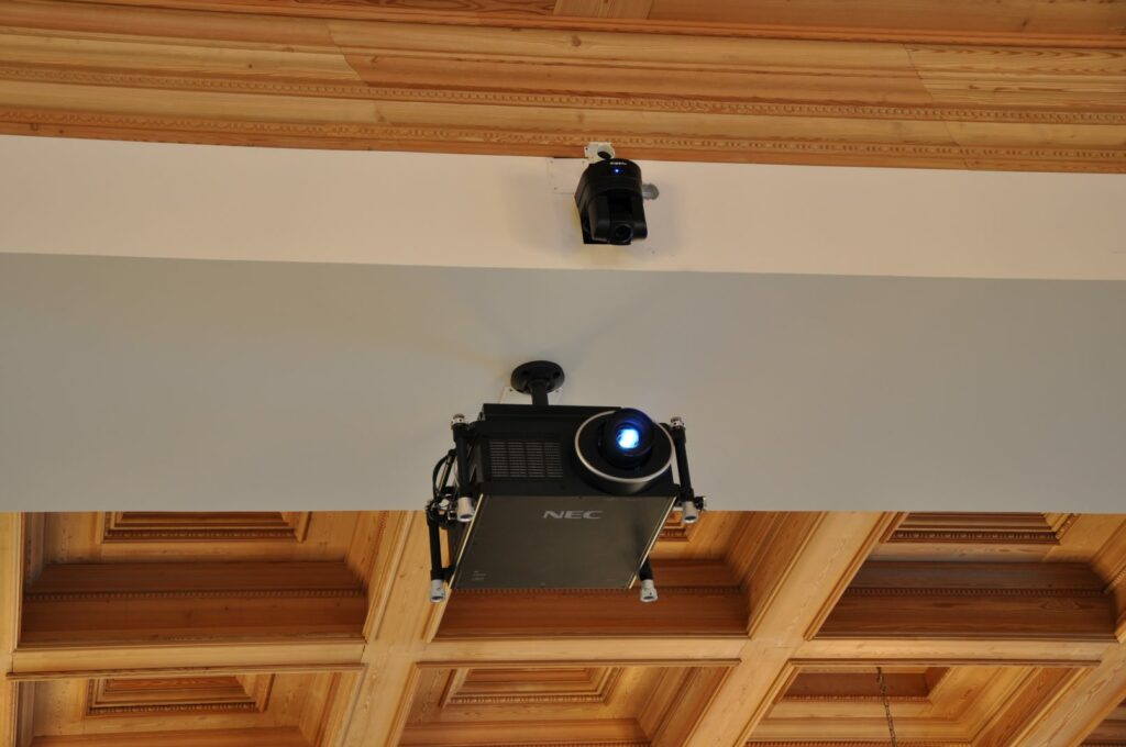 A high quality NEC projector is used to display the video. The prefabricated 5-meter-wide screen can be erected according to the event scenario. In the center of the hall, a ceiling-mounted high-quality (HD) video camera VADDIO is installed on the ceiling, which is designed to film the ongoing event and display it directly on the screen.