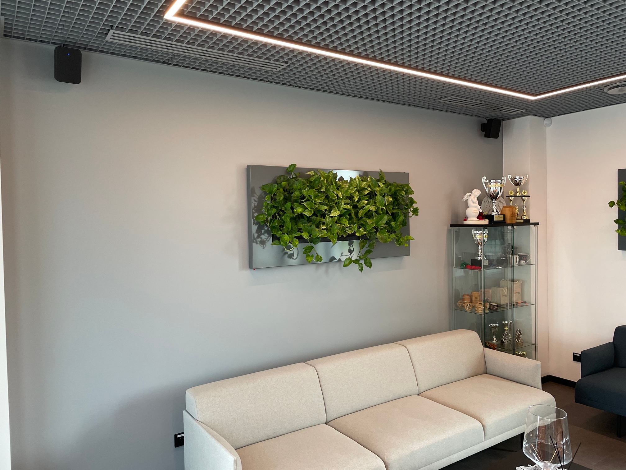 Keturis pastato aukštus užimančio biuro foninio garso sistema naudoja šiandien sparčiai populiarėjančius PoE garsiakalbius iš Bluesound. Šie garsiakalbiai veikia LAN PoE arba WiFi tinklo pagrindu, jiems nereikia išorinių stiprintuvų ar media grotuvų – visas funkcijas atlieka pats garsiakalbis, o garsas valdomas kompiuteriu ar išmaniu įrenginiu. Sistema leidžia įvairiai sugrupuoti garsiakalbių tinklą į atskiras garso zonas, o skaitmeninis signalo perdavimas užtikrina aukštesnę garso kokybę, nei įprastos pastatų garso sistemos.