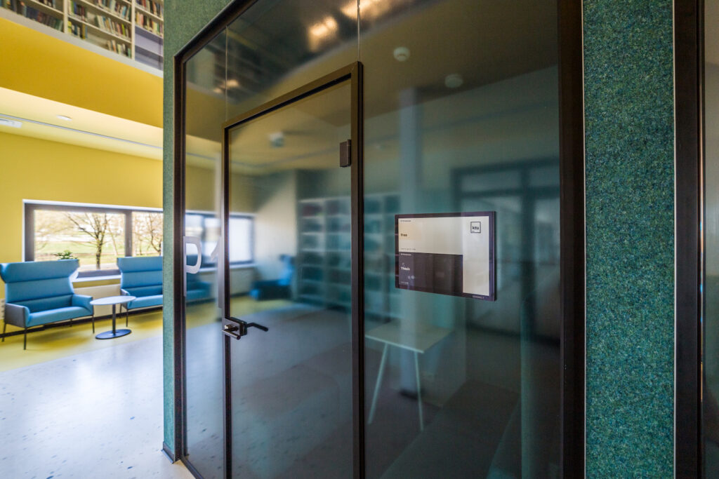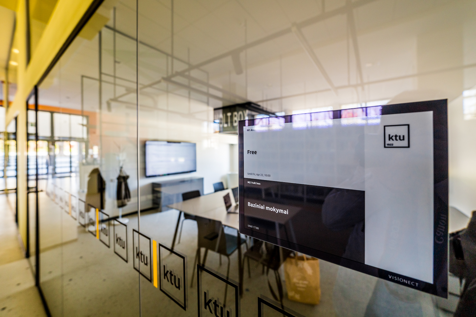 Kadangi pastate įrengta daug posėdžių-komandinio darbo salių, buvo būtina įdiegti sprendimą salių užimtumo suvaldymui, naudotojų ir svečių informavimui. Buvo pasirinkti inovatyvūs ir energiją tausojantys elektroninio rašalo (E Ink) technologijos ekranai Joan. Net 13″ dydžio ekranai gali atvaizduoti iki 9 kambarių užimtumą, o viena įkrova baterija gali veikti iki vienerių metų. Prietaiso instaliacijai nereikia jokių laidų, pakanka Wifi tinklo, o ekraną galima tiesiog prilipinti prie stiklo pertvaros specialaus dvipusio lipnaus-magnetinio laikiklio pagalba. Registratūroje ir prieigose buvo įrengti didelio formato ekranai, atvaizduojantys bendrą visų salių užimtumo informaciją.