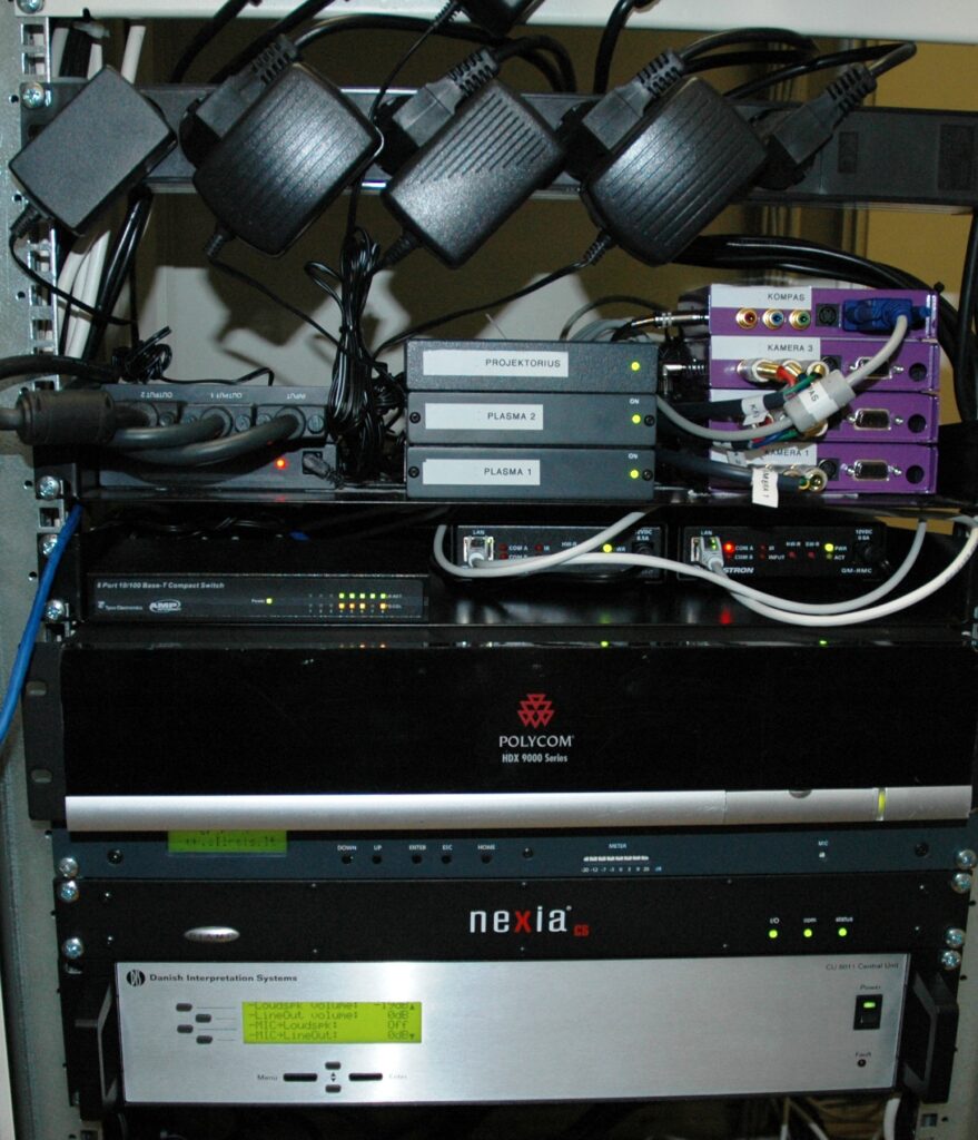 Vaizdo kamerų, diskusijų sistemos, garso pulto, vaizdo projektoriaus, plazminių ekranų bei Polycom HDX-9000 sistemos valdymui panaudota Crestron e-Control programinė įranga. e-Control valdymo sistema leidžia naudojantis standartinio kompiuterio interneto naršykle valdyti visą minėtą įrangą viename lange tiesiog kompiuterio pelės pagalba.