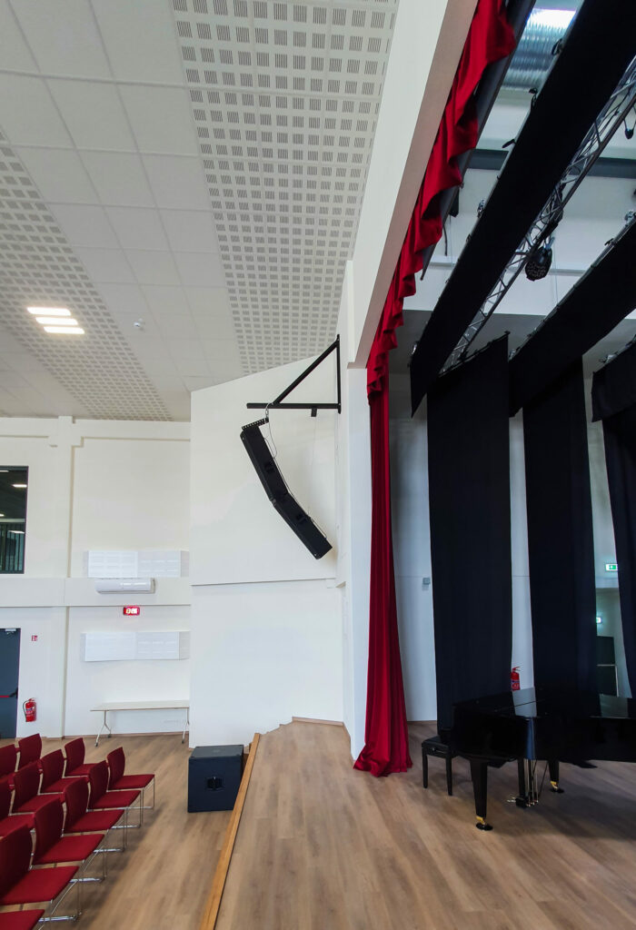 Garso sistemą įrengėme atsižvelgiant į salės išplanavimą. Buvo sumontuota Line Array tipo sistema, kuri užtikrina tolygų garso pasiskirstymą salėje. Visa valdymo įranga susieta skaitmeniniais signalais ir atitinka naujausius standartus rinkoje.