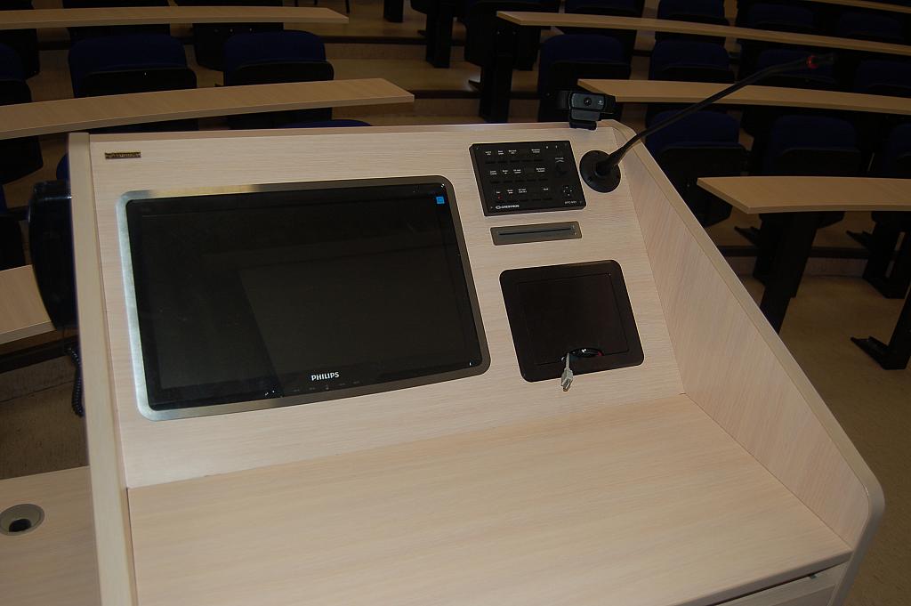 Kiekvienos auditorijos tribūnoje įmontuota Crestron valdymo klaviatūra su integruotu procesoriumi. Klaviatūros mygtukai užprogramuojami atskirai pagal paskaitoms parinktus scenarijus – įjungiamas kompiuteris, valdomas garsas, projektoriai, ekranai, šviesų valdymas ir pan.