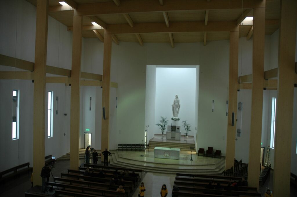 Švč. Mergelės Marijos Nekalto Prasidėjimo bažnyčios pastatas primena du maldai suglaustus delnus. Bažnyčia išsiskiria erdvumu, šviesumu. Bažnyčios plotas – 1100 kvadratinių metrų, vienu metu bažnyčioje gali sutilpti virš 700 maldininkų.