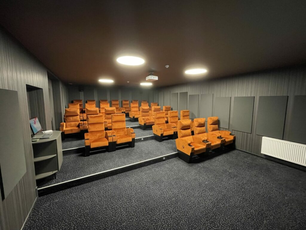 Prie kokybiškų paslaugų paketo prisidėjome ir mes – Audiotonas. Tarp sveikatinimo procedūrų, sanatorijos lankytojai galės mėgautis aukščiausios kokybės kino garsu ir vaizdu. Džiaugiamės šiuo projektu, kadangi turėjome galimybę sukurti sinergiją tarp architektūrinių ir techninių sprendinių – tokiu būdu ne tik pagerinome fizines kino salės akustines savybes, pritaikėme interjero spalvinę gamą, bet ir parinkome racionaliausius techninius sprendinius, kas leido pasiekti geriausią rezultatą racionaliai panaudojant projektui skirtas lėšas.