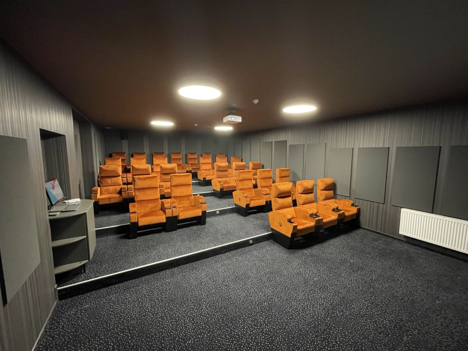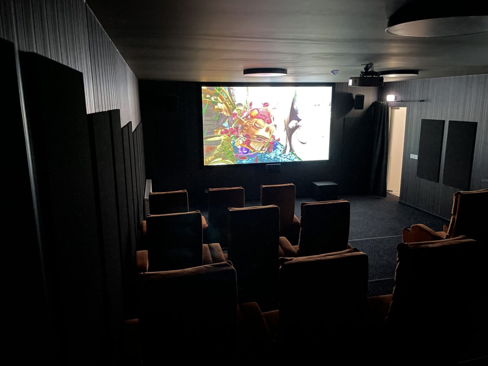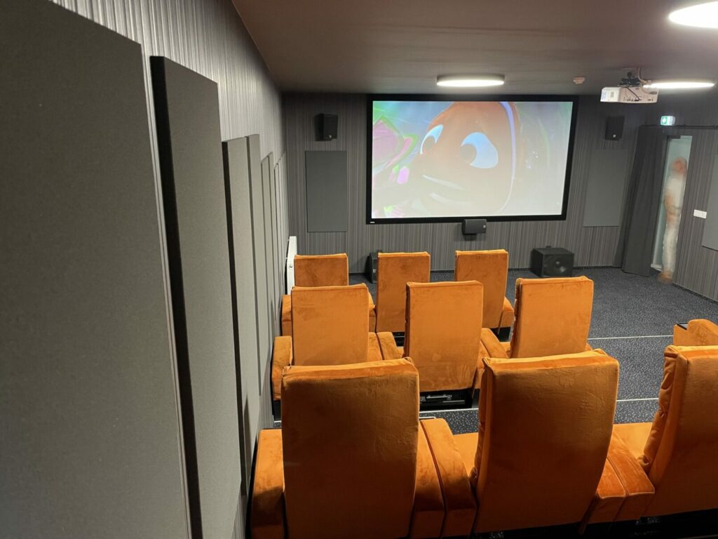 Salės sienų perimetrą padengėme specialiomis akustinėmis plokštėmis, kurios sugeria garso bangas, tokiu būdu ženkliai sumažinome nepageidaujamus garso bangų atspindžius. Tai ženkliai pagerino salės akustinės savybes ir leido sukurti „tikros kino salės“ įspūdį. Interjero spalvos ir medžiagos taip pat buvo parinktos atsižvelgiant į mūsų pastabas – tamsūs sienų, lubų ir grindų tonai neblaško žiūrovų ir leidžia susikoncentruoti į filme vykstantį veiksmą.