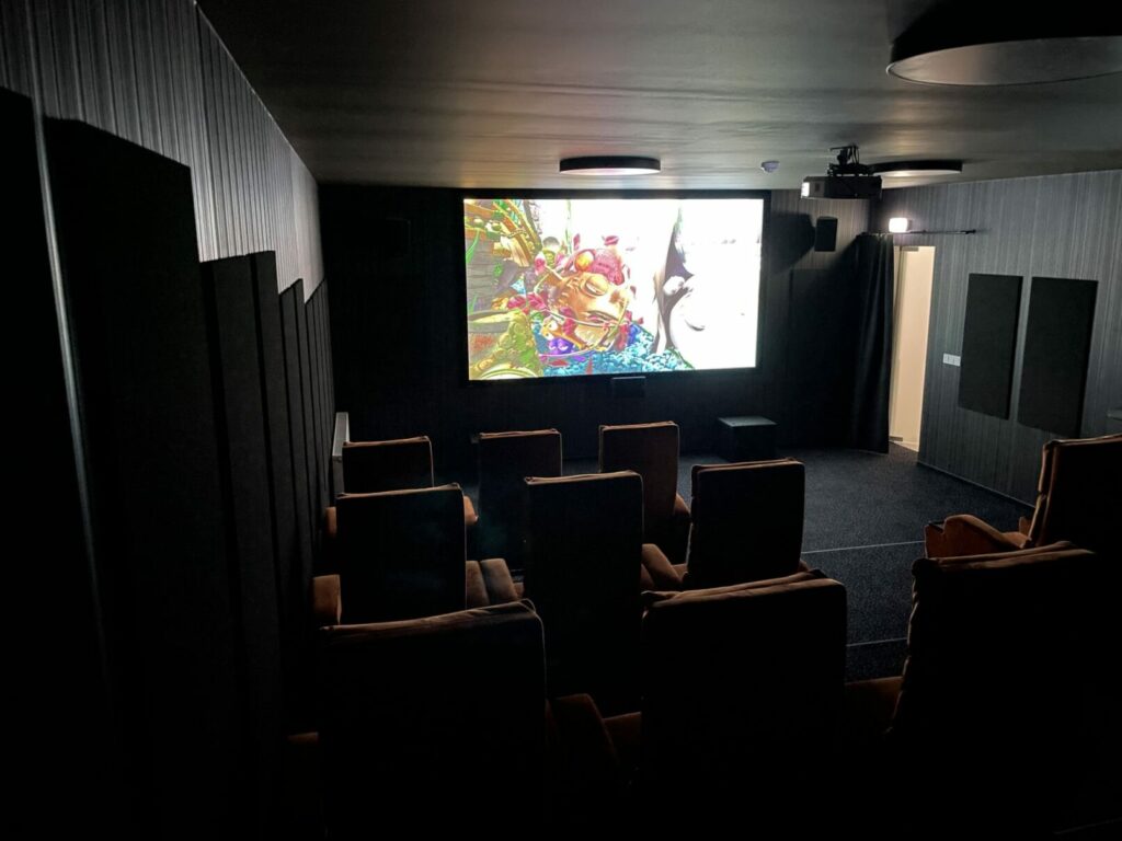 Vaizdo projektorius projektuoja 4K raiškos vaizdą ant 3 metrų pločio plataus formato projekcinio ekrano, kurio projekcinė medžiaga yra specialiai pagaminta demonstruoti 4K raiškos vaizdą – kad nei vienas pikselis nebūtų prarastas dėl medžiagos netolygumo. Projekcinės medžiagos atspindžio koeficientas ir projektoriaus šviesumas parinktas toks, kad užtikrintų komfortišką perėjimą iš tamsių scenų į šviesias scenas – kad akys lengviau adaptuotųsi – tai yra labai svarbu įrengiant kino salės vaizdo sistemą.