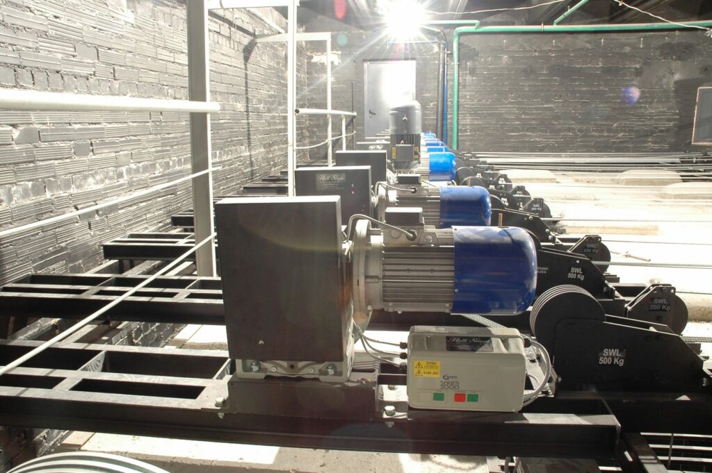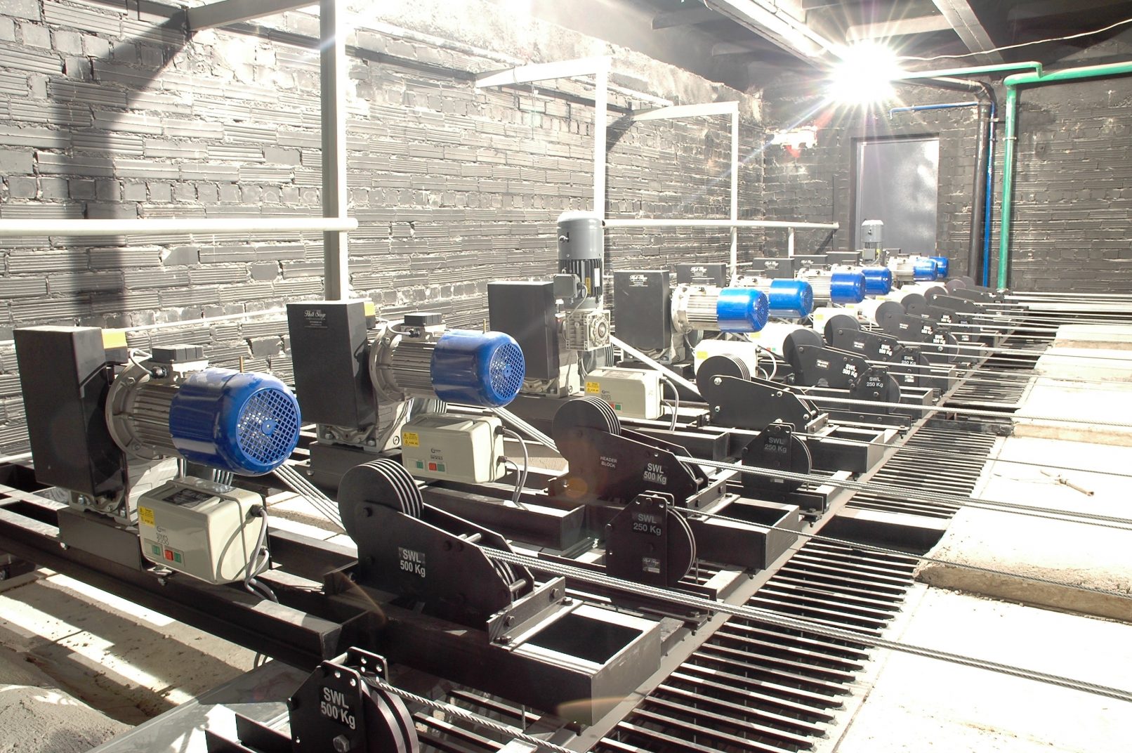 Scenos mechanizmų sistemą sudaro 4 motorizuoti apšvietimo tiltai, 22 motorizuoti dekoracijų keltuvai, įrengta priekinės uždangos motorizuotas mechanizmas. Visi scenos viršutinės mechanizacijos įrenginiai yra pagaminti D. Britanijos gamintojo Hall Stage, turinčios daugiau kaip 100 metų veiklos patirtį viso pasaulio scenos technologijų rinkoje.
