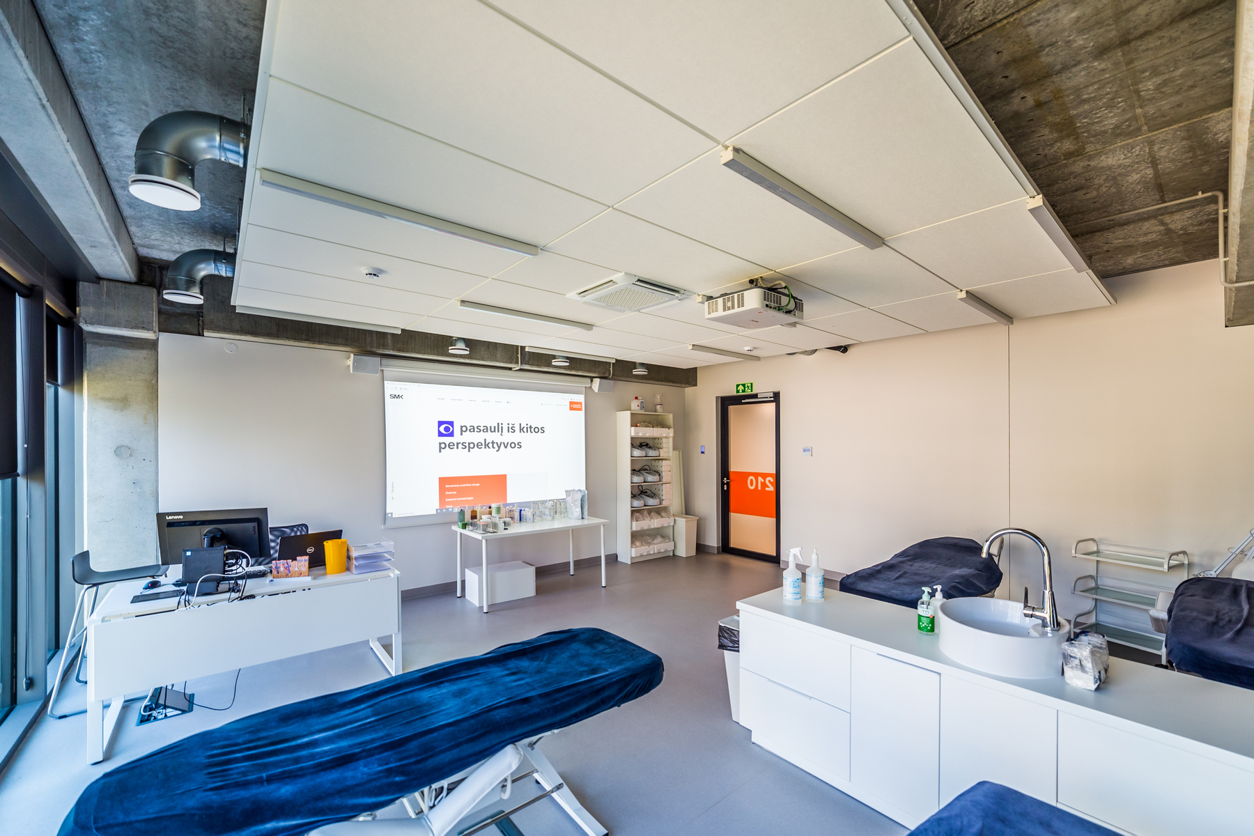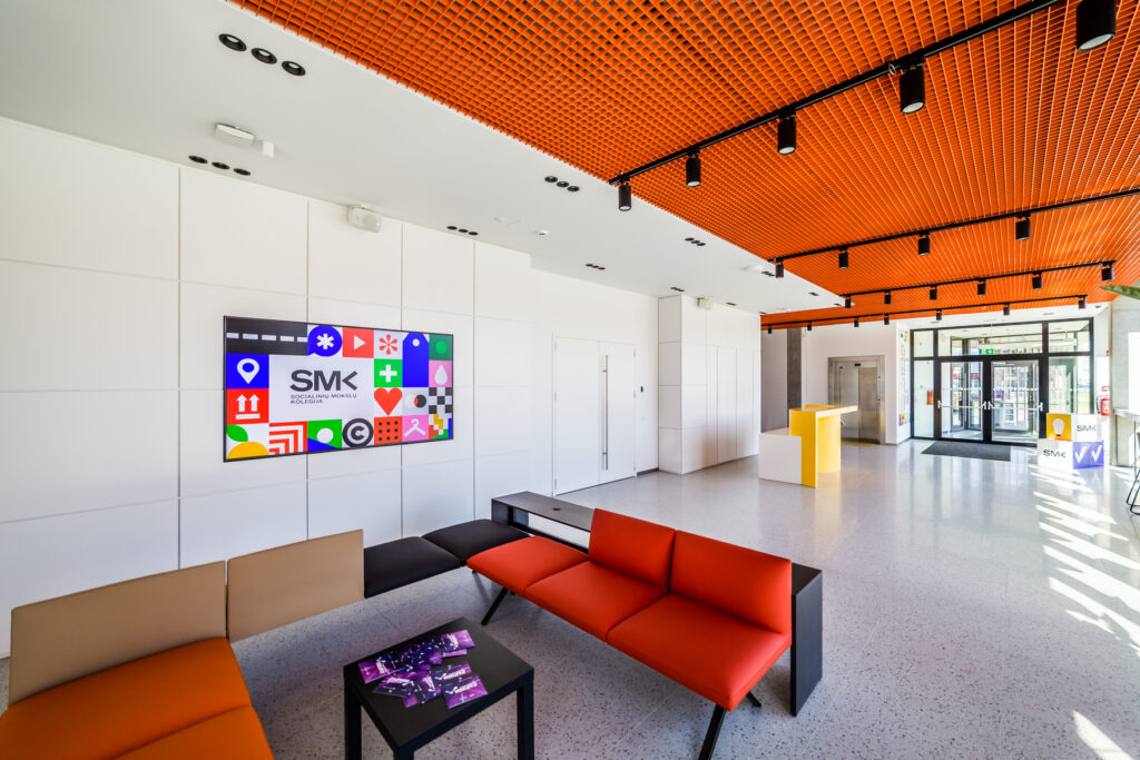 UAB „Audiotonas“ SMK pastato statybų projekte dalyvavo įrengiant auditorijų apšvietimo, garso, vaizdo ir klimato valdymo sistemas, o bendrose pastato erdvėse – foninio įgarsinimo bei informacinių ekranų sistemas. Paskaitų reikmėms įrengtos 26 auditorijos, kuriose įranga valdoma kiekvienoje patalpoje esančiu 5“ liečiamu ekranu. Pasirinktas valdymo sprendimas supaprastina įrangos naudojimą, nes paruošti auditoriją paskaitai leidžia vos vienu paspaudimu, sistemą lengva perprasti net pirmą kartą besinaudojantiems vartotojams. Valdymo ekranas apjungia projektoriaus, projekcinio ekrano, garso sistemos ir patalpos apšvietimo parametrus, taip pat leidžia patogiai reguliuoti auditorijos vėdinimo ir šildymo sistemos veikimą. Apšvietimo valdymui įdiegta itin patikima Crestron gamintojo DALI sistema, integracija su ŠVOK sistemomis realizuota naudojant Bacnet.