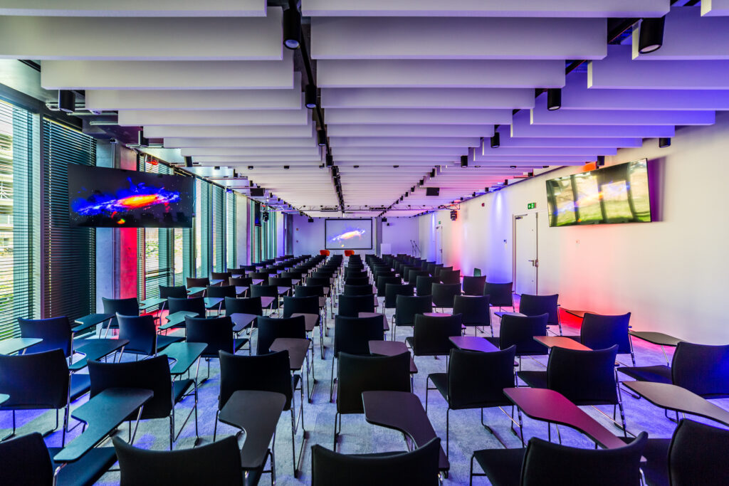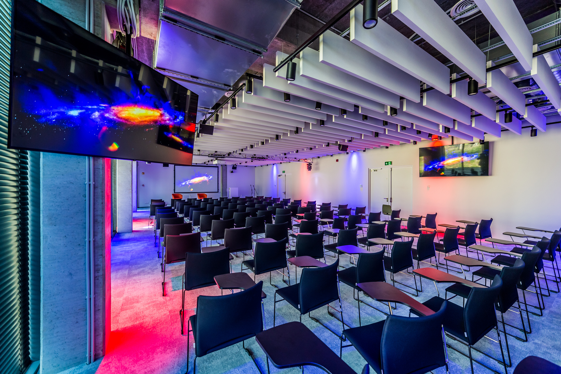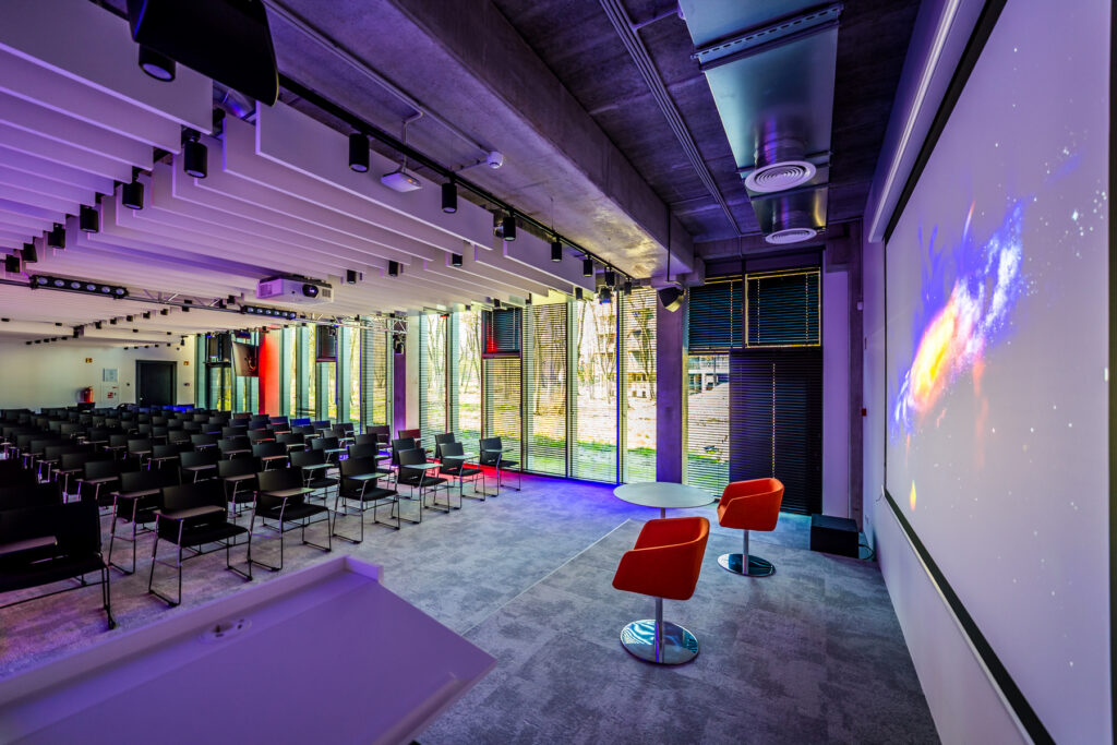 Dar daugiau funkcionalumo turi pirmajame pastato aukšte esanti konferencijų salė. Sumontuotas lazerinis NEC vaizdo projektorius, vaizdą dubliuojantys 75“ monitoriai, aukštos raiškos valdomos vaizdo kameros renginių filmavimui, tiesioginei transliacijai internetu, bei vaizdo konferencijų organizavimui. Įdiegta gamintojo Martin audio CDD serijos akustinė sistema, skaitmeniniai garso, apšvietimo valdymo pultai, gamintojo Shure mikrofonų sistema. Sumontuoti galingi Claypaky Mini-B judantys LED šviestuvai bei kita apšvietimo įranga, todėl salė pritaikyta ne tik modernioms hibridinėms paskaitoms, bet ir dideliems renginiams, muzikiniams pasirodymams.