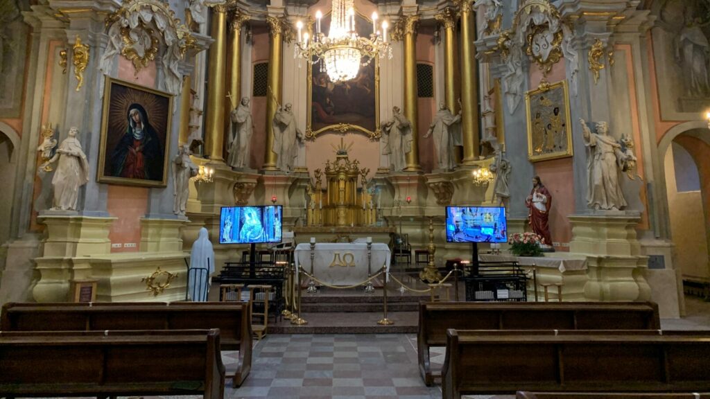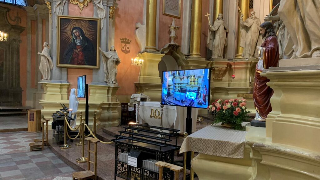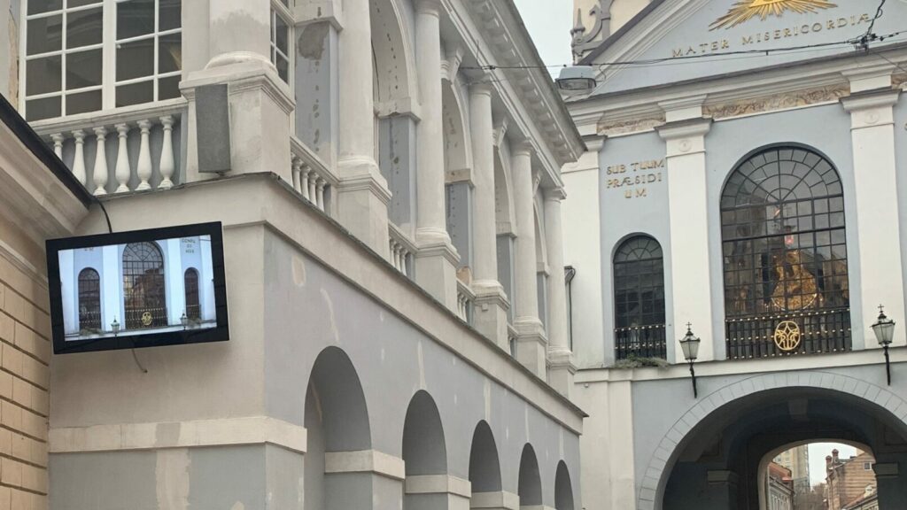 Šv. Teresės Bažnyčios ir Aušros Vartų koplyčioje Vilniuje įrengėme vaizdo transliavimo sistemą. Sumontavome nuotoliniu būdu valdomų vaizdo kamerų sistemą, kuri vykstančių pamaldų vaizdą iš Aušros Vartų koplyčios ir Šv. Teresės Bažnyčios perduoda į šešis lauke ir Bažnyčios viduje sumontuotus 55″ įstrižainės didelės raiškos ekranus.