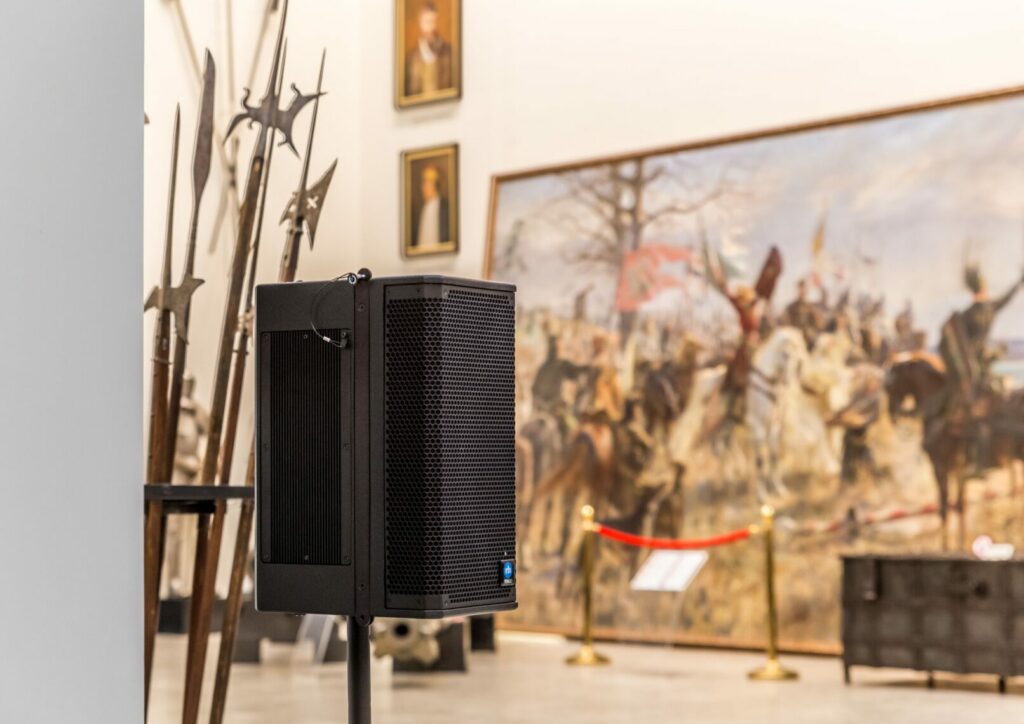 Ekspozicijų salėje suderinome akustines sistemas taip, kad jas būtų galima naudoti tiek kaip stereo porą, tiek kaip sistemą su užvėlinta linija – pagrindinę akustinę sistema statome salės priekyje, o kitą – salės viduryje, su garso užvėlinimu – tokiu būdu pratęsiame garso sklaidos padengimą net iki 35 metrų. Perjungti režimą iš stereo poros į užvėlintos linijos konfigūraciją galima vieno mygtuko paspaudimu, indikacinis ekranas ir mygtukai yra integruoti galinėje akustinės sistemos dalyje. Tokiu būdu ši akustinė sistema yra kiek įmanoma universali ir tuo pačiu panaudojama mobiliai.