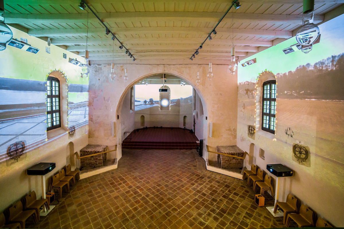 Panaudotas prožektorių kiekis ir tipas leidžia išryškinti esamas freskas, užlieti sienas pasirinkta spalva pagal šviesų dailininko sumanymus, kuris šviesų valdymą atlieka programuojamu DMX valdymo pultu.